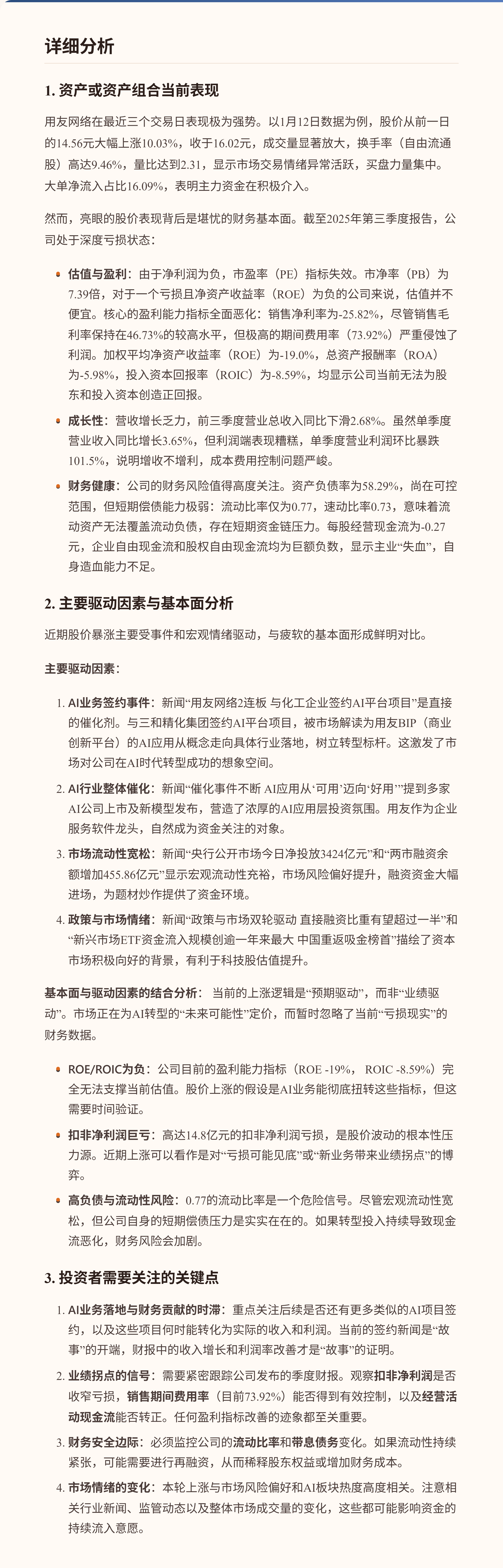 $用友网络(SH600588)$ 用友网络近期股价表现强势,连续涨停,核心驱动因素是市场对其AI业务落地的乐观预期,如与三和精化签约AI平台项目。然而,投资者需警惕其基本面与股价表现的巨大背离。公司当前处于严重亏损状态,净资产收益率(ROE)为-17.86%,扣非净利润巨亏,且面临显著的短期偿债压力(流动比率仅0.77)。当前上涨更多由事件和情绪驱动,而非业绩支撑。