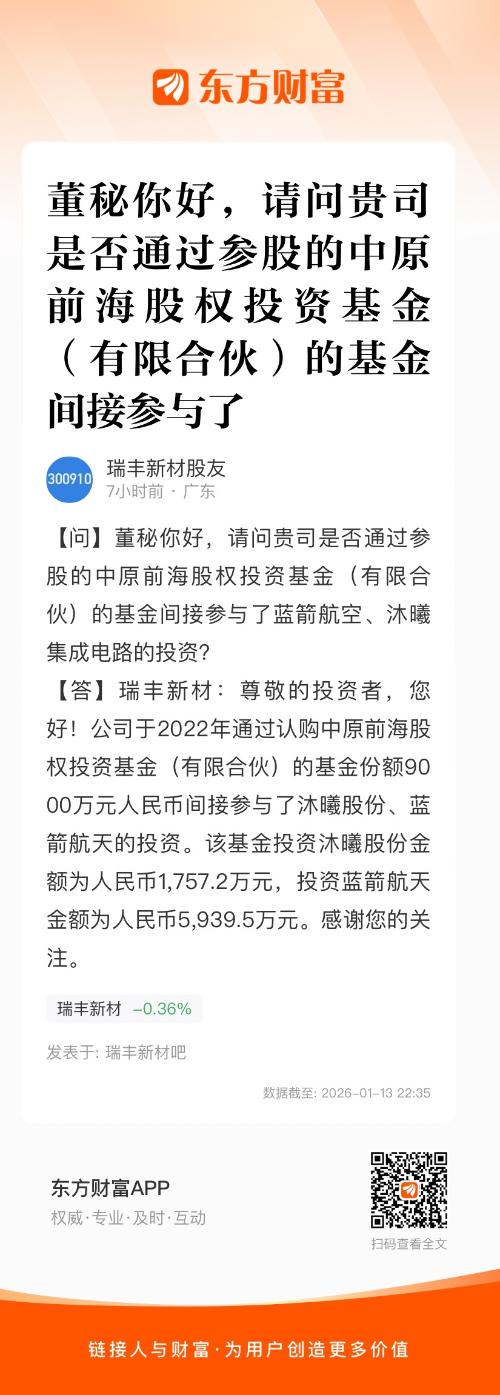 董秘你好,请问贵司是否通过参股的中原前海股权投资基金(有限合伙)的基金间接参与了蓝箭航空、沐曦集成电路的投资?