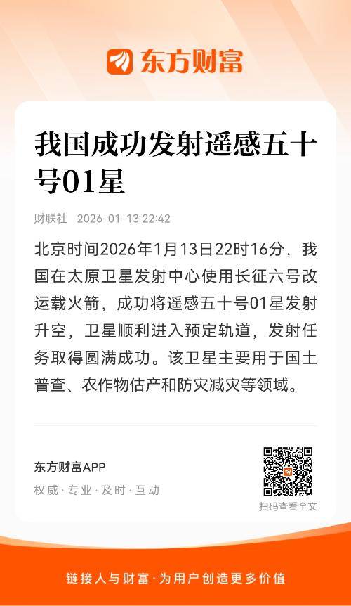 北京时间2026年1月13日22时16分,我国在太原卫星发射中心使用长征六号改运载火箭,成功将遥感五十号01星发射升空,卫星顺利进入预定轨道,发射任务取得圆满成功。该卫星主要用于国土普查、农作物估产和防灾减灾等领域。