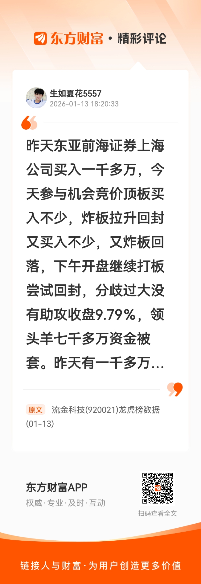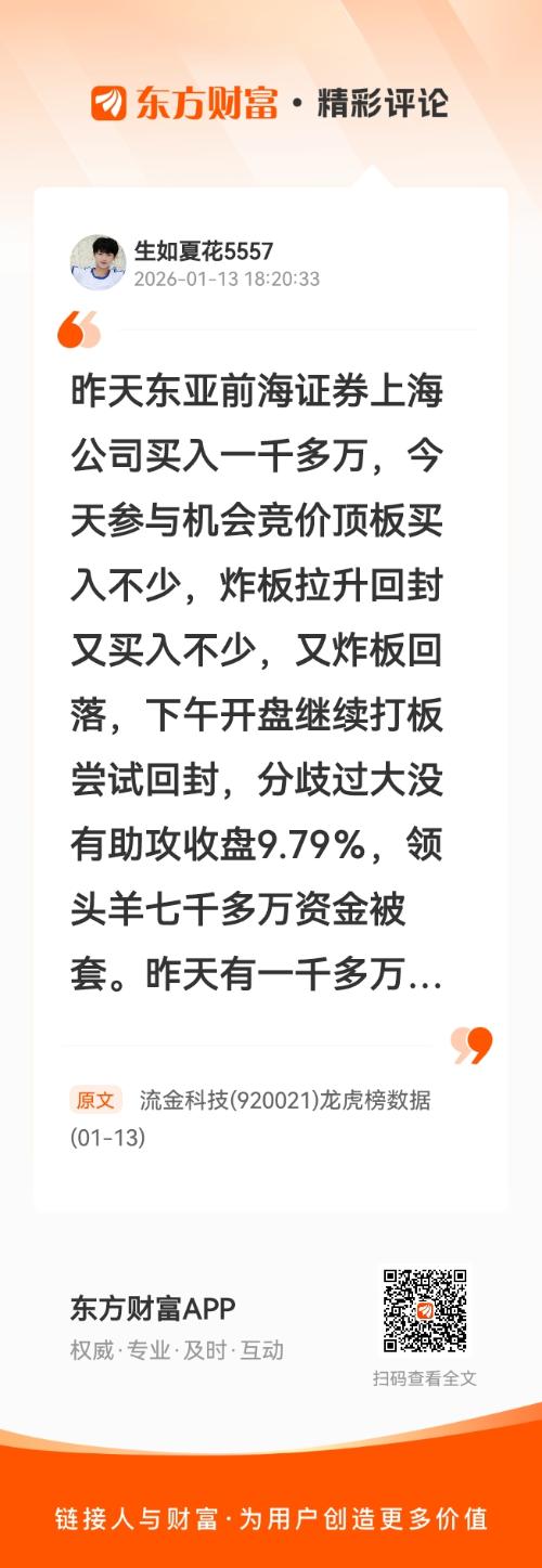 昨天东亚前海证券上海公司买入一千多万,今天参与机会竞价顶板买入不少,炸板拉升回封又买入不少,又炸板回落,下午开盘继续打板尝试回封,分歧过大没有助攻收盘9.79%,领头羊七千多万资金被套。昨天有一千多万资金获利10%以上,今天买入七千多万资金,平摊成本都12以上了。其他柚子和散户12~10.7成本。上午第二炸板前换手28%,炸板回落到收盘换手31%,全天换手放量明天回调概率很大,明天要是高走自救拉升+接力资金助攻收盘12以上比较完美,周四继续新高就是主升浪趋势开启。 我在《流金科技(920021)龙虎榜数据(01-13)》的评论获得了大家的关注。