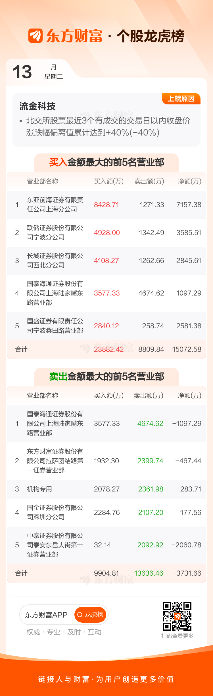 交易所2026年1月13日公布的交易公开信息显示,流金科技因成为当日换手率达到20%的前5只股票、北交所股票最近3个有成交的交易日以内收盘价涨跌幅偏离值累计达到+40%(-40%)上榜。流金科技当日收报10.44元,涨跌幅9.78%,偏离值59.14%,换手率59.14%,成交额16.23亿。异常期间1月9日至1月13日,期间涨幅50.00%,累计偏离值46.21%,区间成交额24.40亿。
