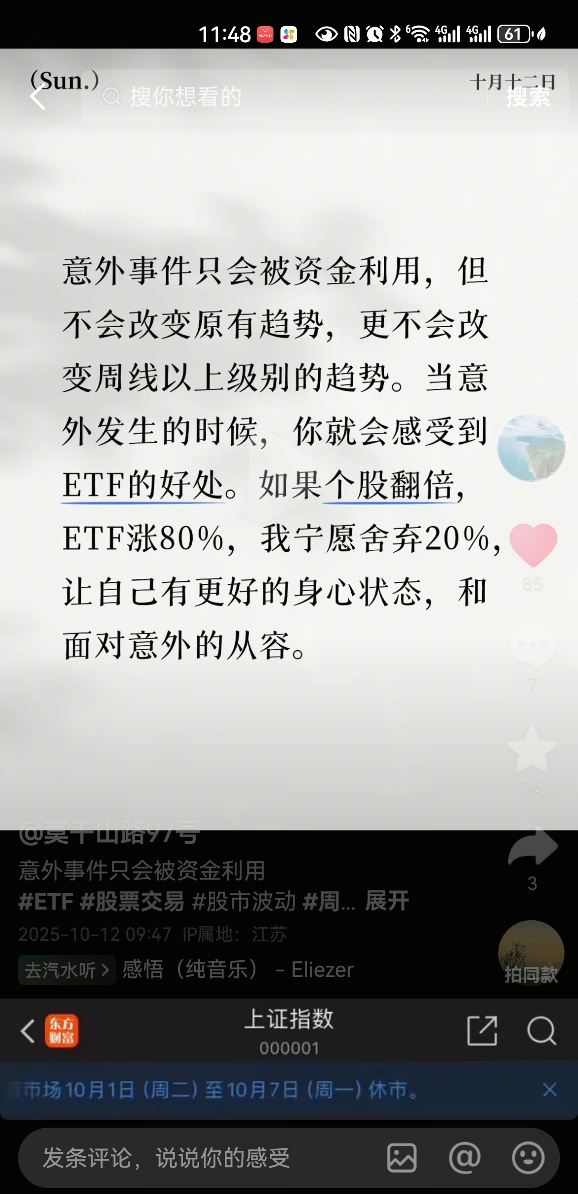 我的心态是炒不了个股的,只要今天买的,明天不涨就受不了,所以无法做个股。心太小,心态太差,所以只能做ETF也必须做ETF以后坚决不碰个股ETF让我的心态变得平和,变得不焦虑,能睡得着觉,但同时要接受ETF的缓慢上涨