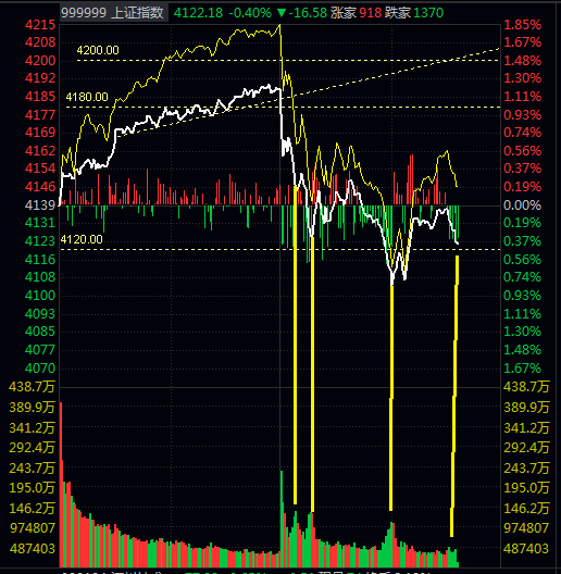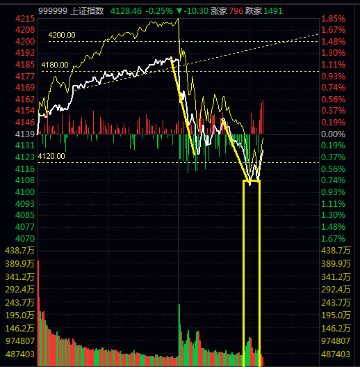 变线前两分钟指数还在顽强上行,黄线在上,市场情绪热烈
