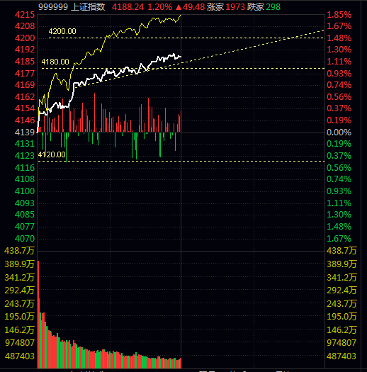 指数缓慢拉升,走势健康,预示4200只是一种态度而是实质的难度,目前市场增量充沛,突破4200点甚至4500点都很轻松,就看调控力度,关键在人不在势