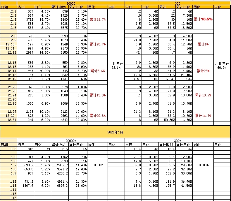 1.13号战绩分享20000u昨天跑了1867.9u,日化在9.3%300u昨天