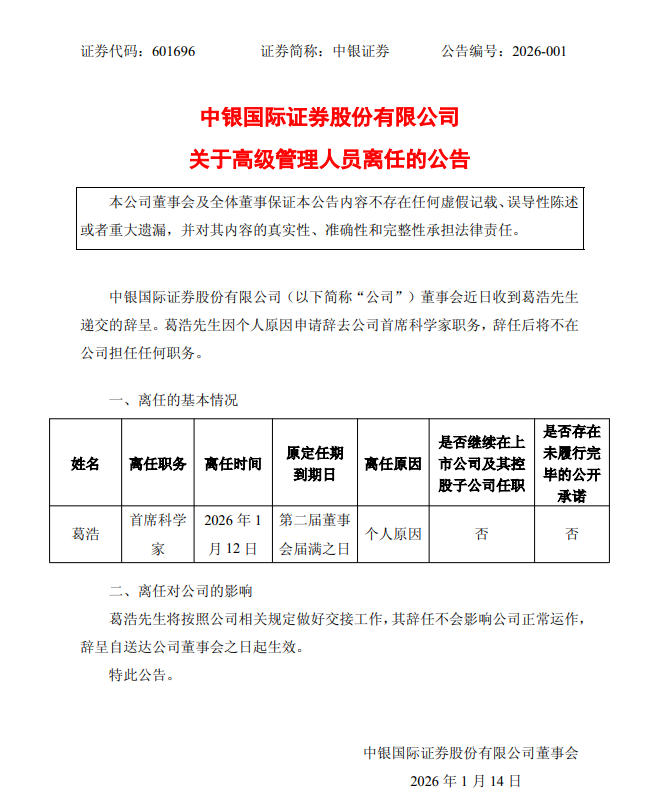 【中银证券:首席科学家葛浩离任】1月13日,中银证券公告称,董事会近日收到葛浩递