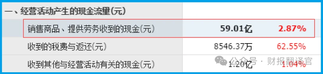但蹊跷之处在于,同期销售商品收到的现金为59.01亿元,仅增长2.87%。