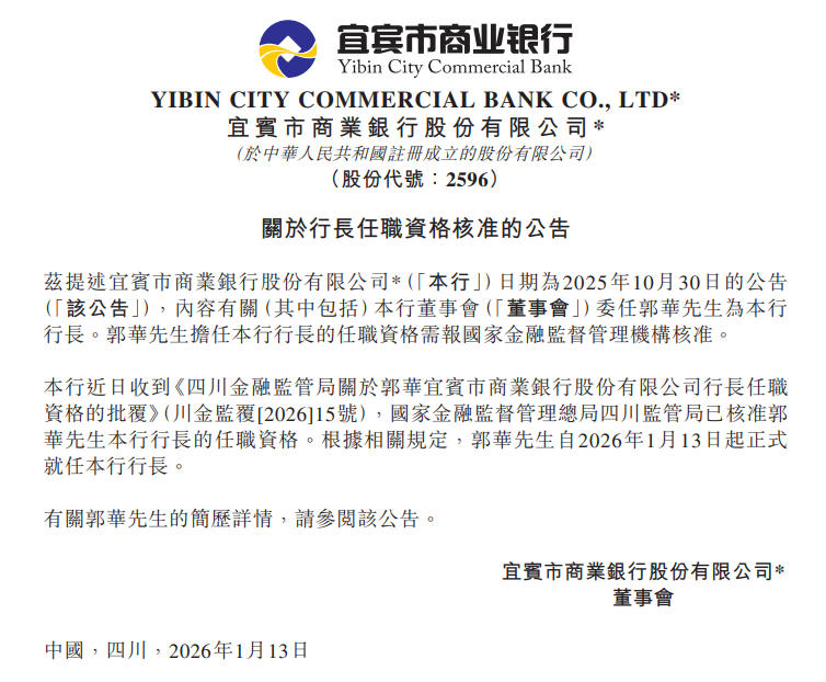 【宜宾市商业银行:1月13日起郭华正式就任行长】1月13日,宜宾市商业银行发布公告指出,该行近日收到《四川金融监管局关于郭华宜宾市商业银行股份有限公司行长任职资格的批复》,国家金融监督管理总局四川监管局已核准郭华该行行长的任职资格。根据相关规定,郭华自2026年1月13日起正式就任宜宾市商业银行行长。