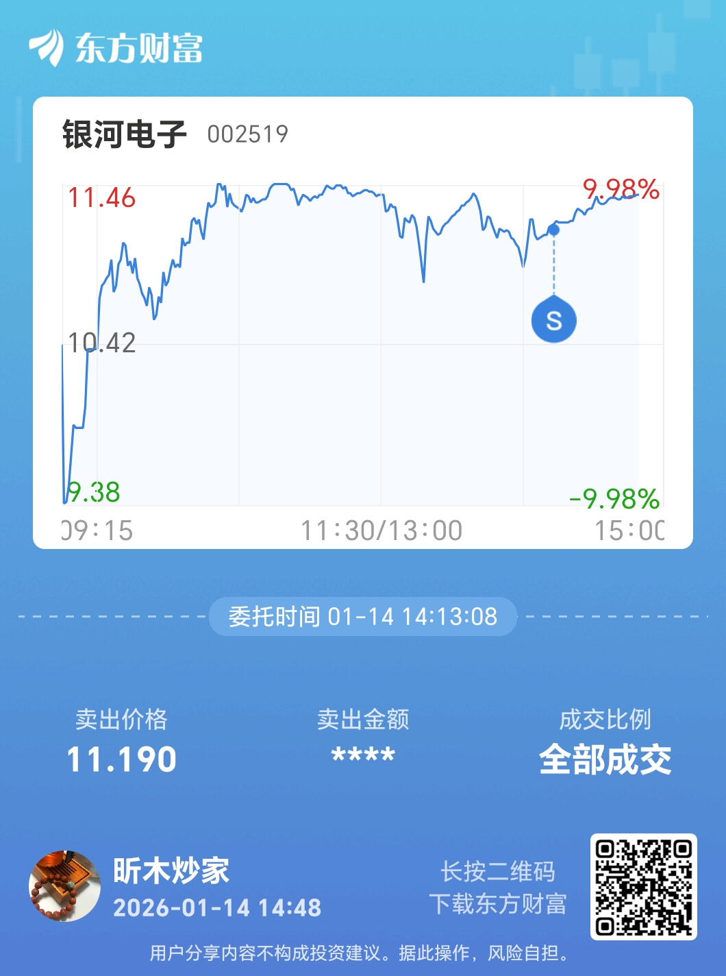 委托标的:银河电子买卖方向:尾盘清仓卖出笔记:尾盘清仓卖出,止盈获利68个点清仓