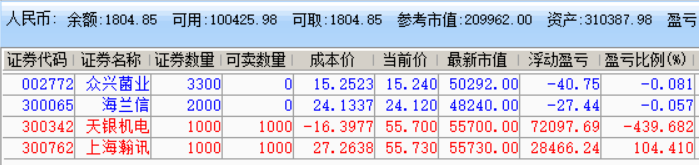 满仓过夜后没有把握好卖点,两股在收盘前择机减仓至单股5万左右的市值,然后在临近尾盘建仓海兰信和众兴菌业两股,每股同样也是5万元左右的底仓。新年第8个交易日,资产也稳步增长到了31万,真正的开门红,连续8个交易日保持正收益,财运不错。