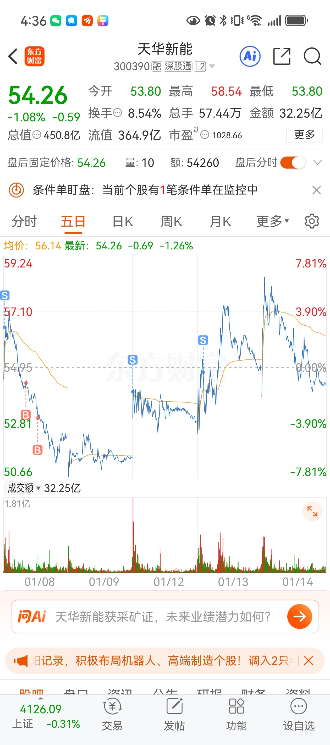 昨天明明已经设置好了条件单,54块卖800股,55.5再卖800股,结果想着昨天休假有时间盯盘,打算先全部卖了回落时再接回800股。事实就是没有回落到我心仪的位置就重新拉升了,今天上午再次拉升。而我空仓……