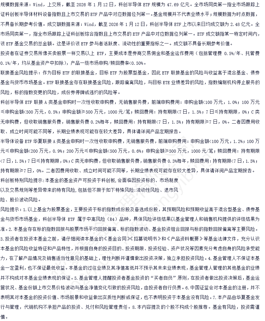·       想稳一点、长期拿着的,选 “半导体材料设备”指数——覆盖更广,包含沪深两市的成熟设备企业,波动小些,政策支持也实打实。目前跟踪该指数的半导体设备ETF华夏(562590)近两周规模增速94%,领先同类ETF。场外联接A:020356;联接C:020357(数据来源:Wind,截至2026.1.12)