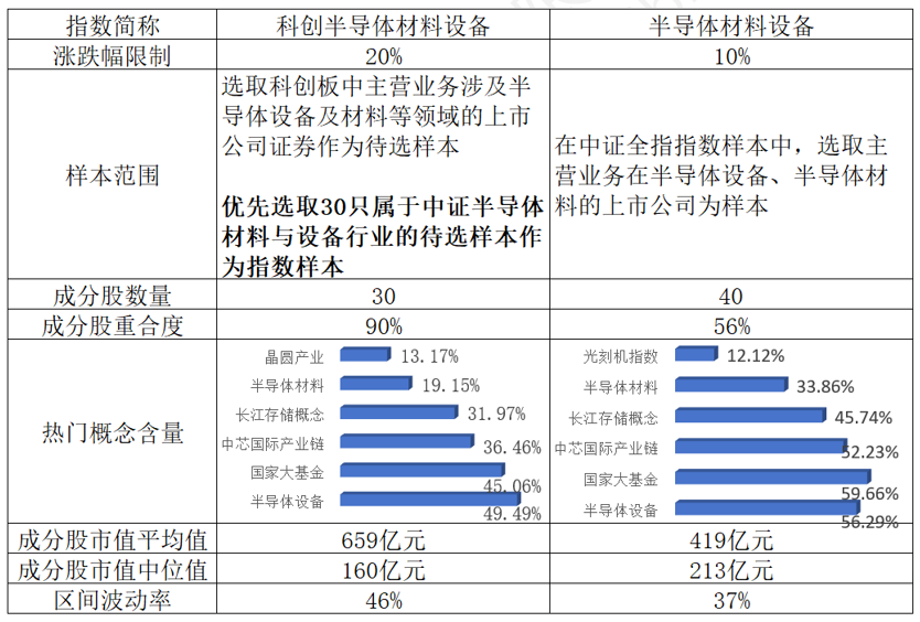 3. “科创半导体材料设备”涨跌幅限制20%波动更大,“半导体材料设备”限10%走势相对平稳