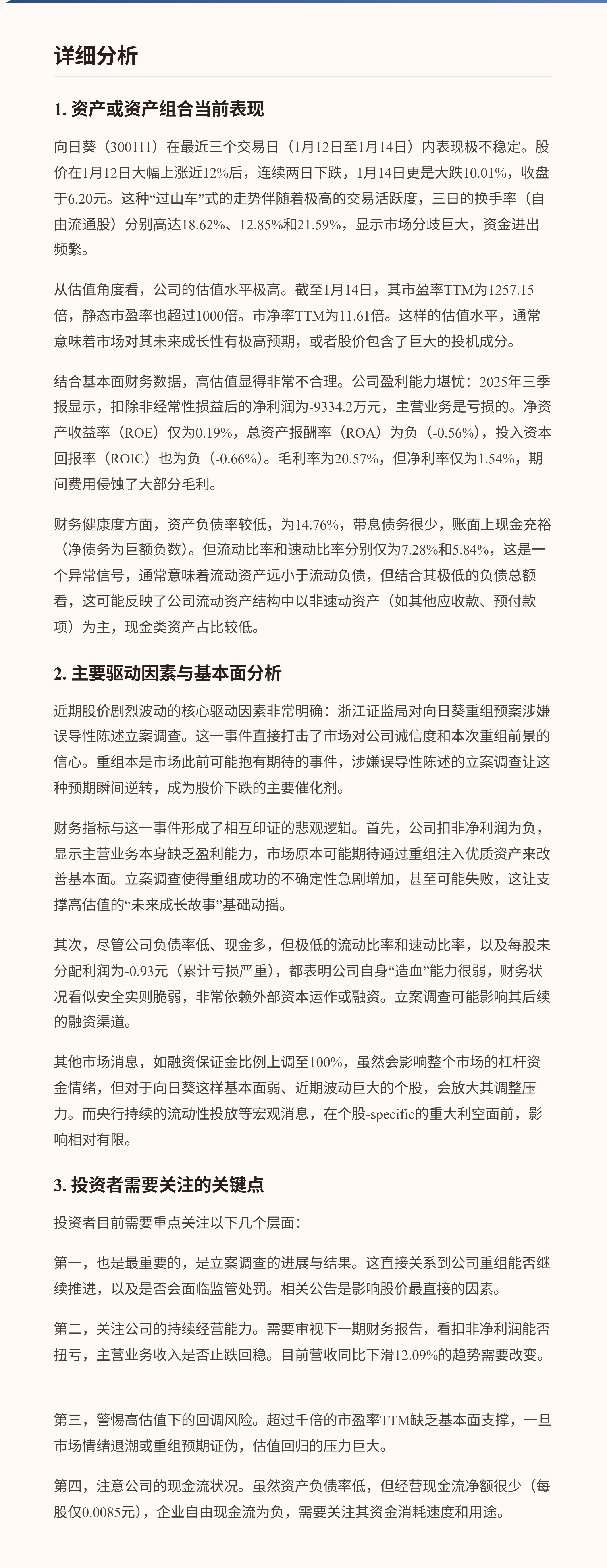 $向日葵(SZ300111)$ 向日葵近期股价出现剧烈波动,三个交易日内经历了大涨后的大幅回调,核心风险在于公司因重组预案涉嫌误导性陈述被立案调查,引发了市场对公司治理和未来发展的严重担忧。从财务数据看,公司基本面非常薄弱,市盈率TTM高达1478倍,估值与盈利能力严重脱节,同时扣除非经常性损益后净利润为负,主营业务处于亏损状态。