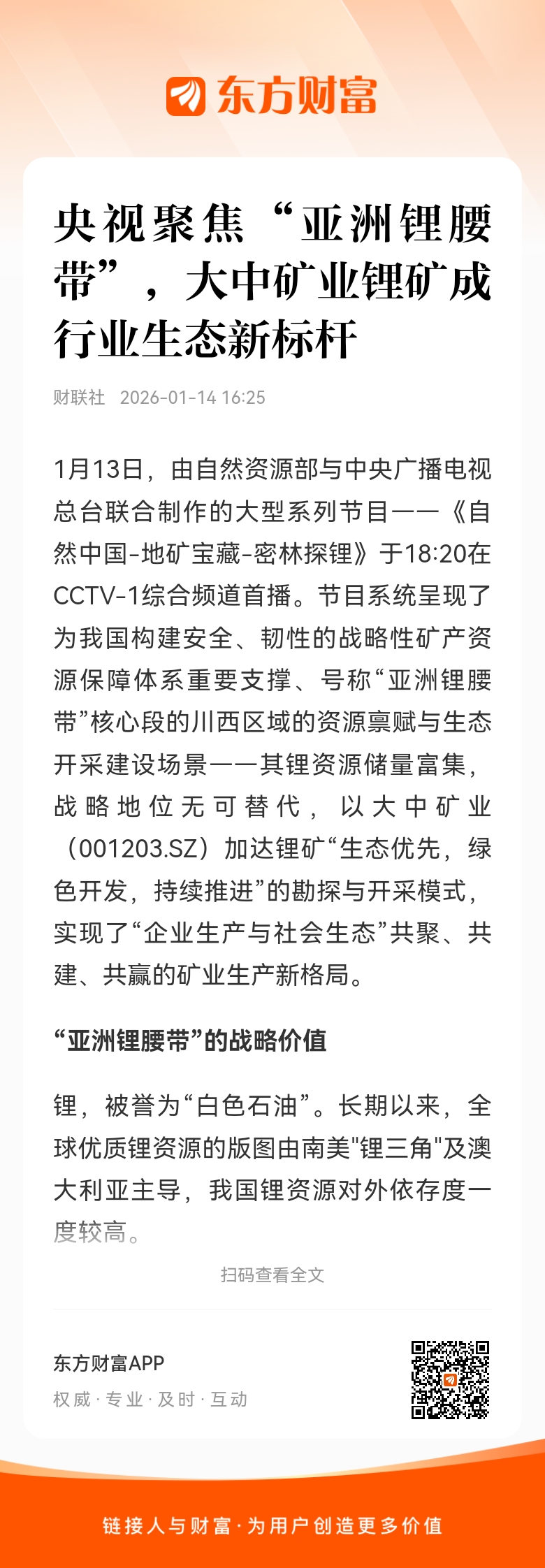 1月13日,由自然资源部与中央广播电视总台联合制作的大型系列节目——《自然中国-地矿宝藏-密林探锂》于18:20在CCTV-1综合频道首播。节目系统呈现了为我国构建安全、韧性的战略性矿产资源保障体系重要支撑、号称“亚洲锂腰带”核心段的川西区域的资源禀赋与生态开采建设场景——其锂资源储量富集,战略地位无可替代,以大中矿业(001203.SZ)加达锂矿“生态优先,绿色开发,持续推进”的勘探与开采模式,实现了“企业生产与社会生态”共聚、共建、共赢的矿业生产新格局。