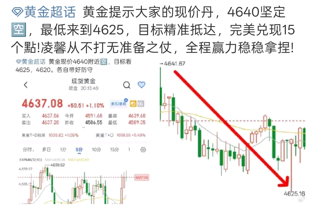 黄金提示大家的现价丹,4640坚定,最低来到4625,目标精准抵达,完美兑现15