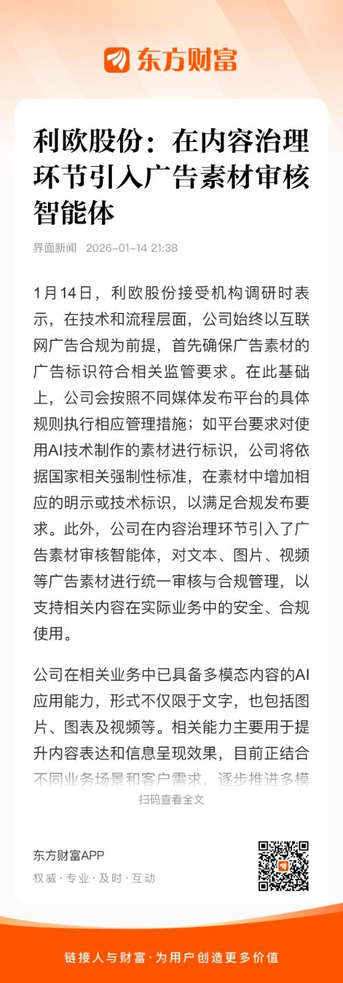 1月14日,利欧股份接受机构调研时表示,在技术和流程层面,公司始终以互联网广告合规为前提,首先确保广告素材的广告标识符合相关监管要求。在此基础上,公司会按照不同媒体发布平台的具体规则执行相应管理措施;如平台要求对使用AI技术制作的素材进行标识,公司将依据国家相关强制性标准,在素材中增加相应的明示或技术标识,以满足合规发布要求。此外,公司在内容治理环节引入了广告素材审核智能体,对文本、图片、视频等广告素材进行统一审核与合规管理,以支持相关内容在实际业务中的安全、合规使用。