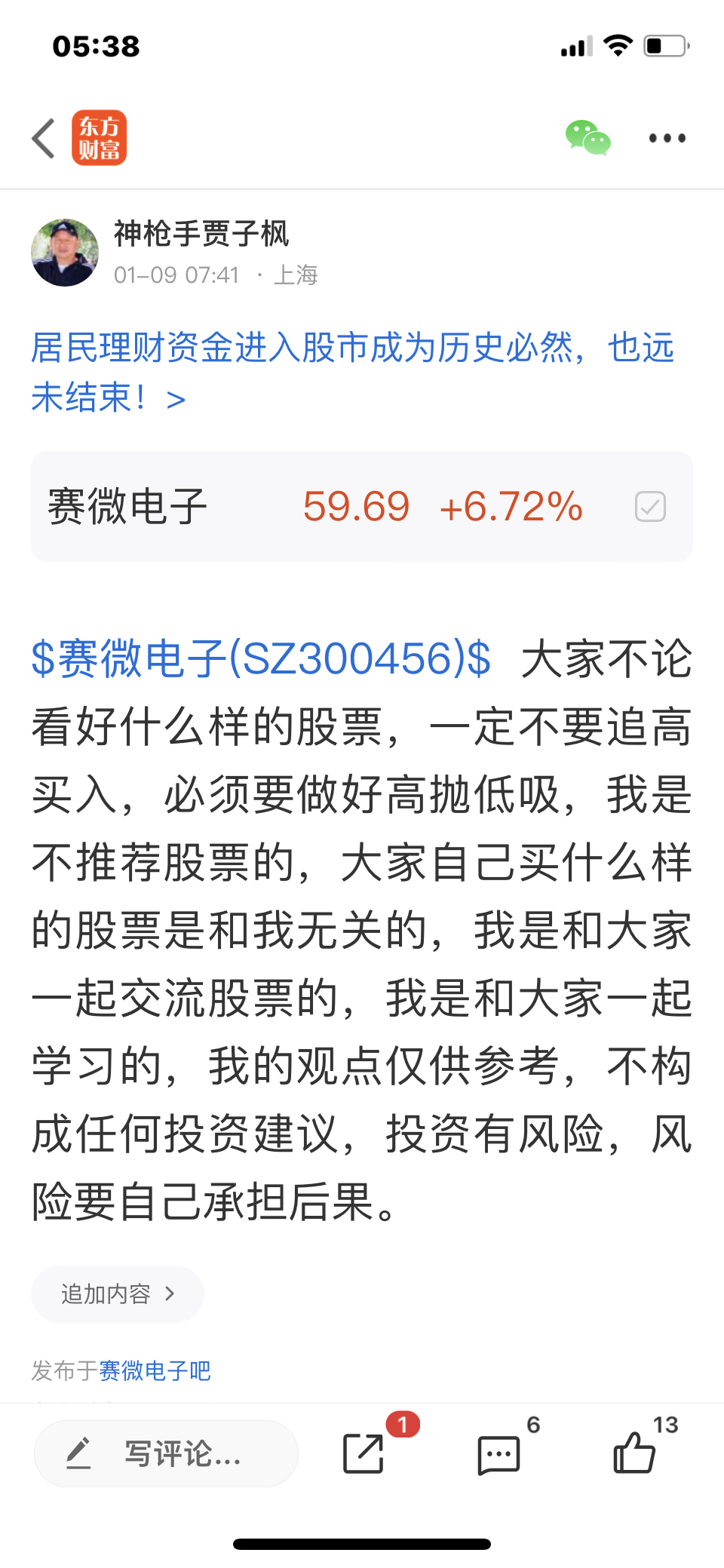我对大盘是看震荡上涨的,大家要多多的关注强势股的走势,大家不要追高买入,必须要做好高抛低吸,我是不推荐股票的,大家不要跟我买卖股票,大家自己买什么样的股票是和我无关的,有黑粉出来说什么是低,我十二月七号看好超捷股份,我十二月二十三号早上八点十分发帖写了超捷股份今天开始反弹,很快就会大涨,我成功的抓到了起动的大妖股,这个就是低,什么是高,我当时判断是第一价位是180元,第二价位是200元,第三价位是260元,这就是高点,我在一月九成功的判断赛微电子开始反弹了,我在十一号的文章里写了,不是反弹了,以是开始反转了,大家可以去看我当时的文章,谢谢大家的转发,