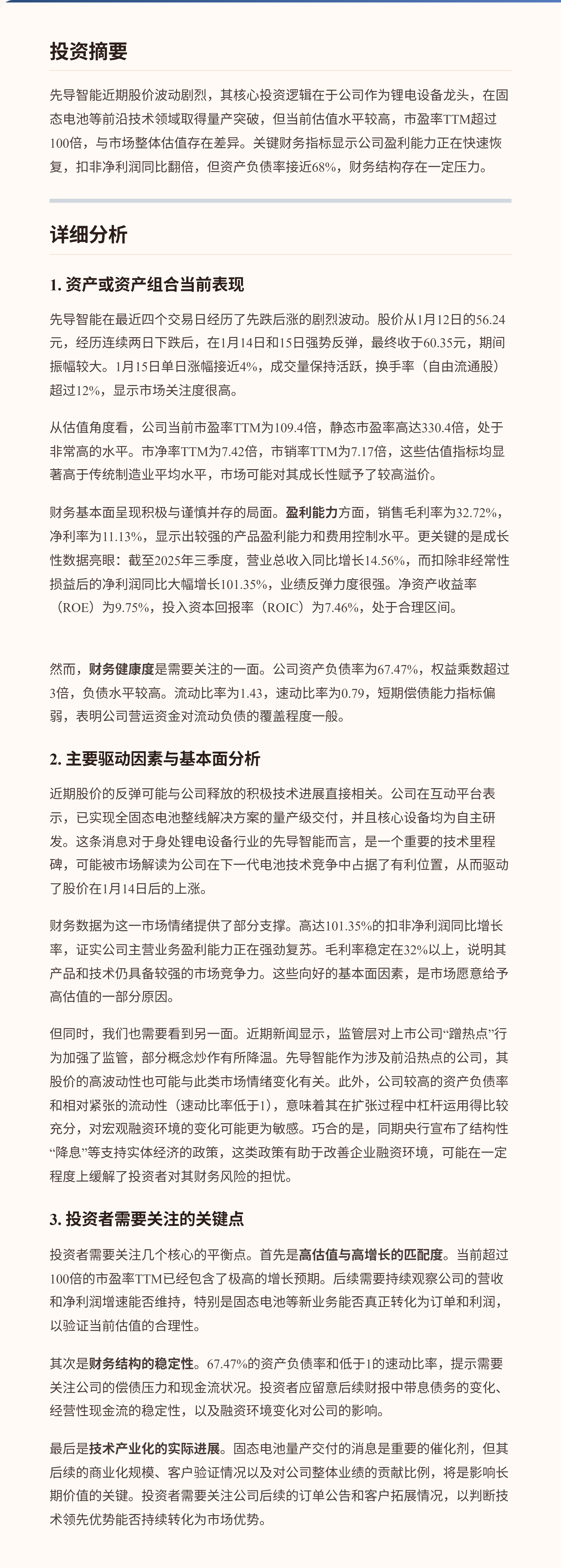 $先导智能(SZ300450)$ 先导智能近期股价波动剧烈,其核心投资逻辑在于公司作为锂电设备龙头,在固态电池等前沿技术领域取得量产突破,但当前估值水平较高,市盈率TTM超过100倍,与市场整体估值存在差异。关键财务指标显示公司盈利能力正在快速恢复,扣非净利润同比翻倍,但资产负债率接近68%,财务结构存在一定压力。