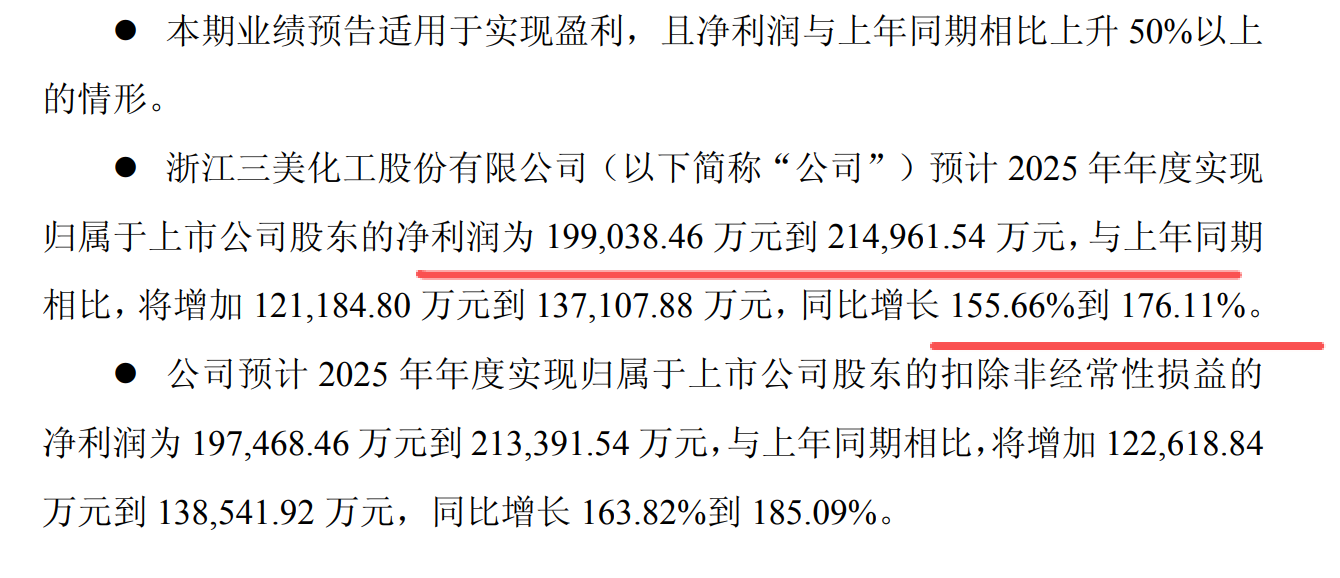 三美股份,这个股票净利润增长156%到176%,净利润达到19.9亿到21亿元。