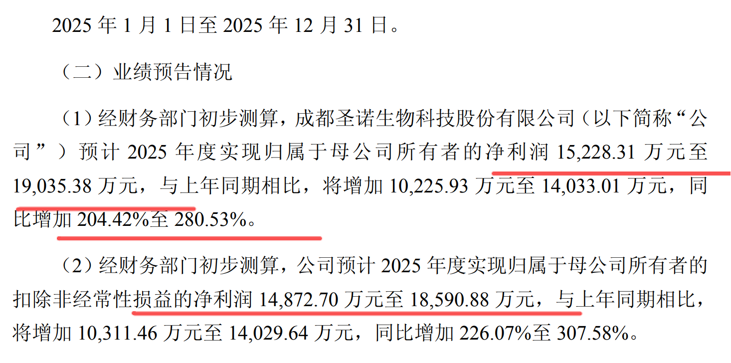 圣诺生物,2025年净利润增204%到281%,达到1.52亿到1.9亿元。