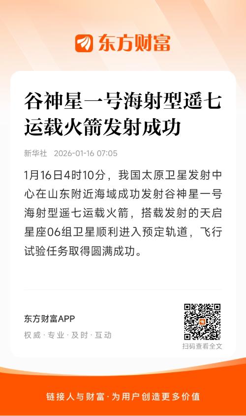 1月16日4时10分,我国太原卫星发射中心在山东附近海域成功发射谷神星一号海射型遥七运载火箭,搭载发射的天启星座06组卫星顺利进入预定轨道,飞行试验任务取得圆满成功。