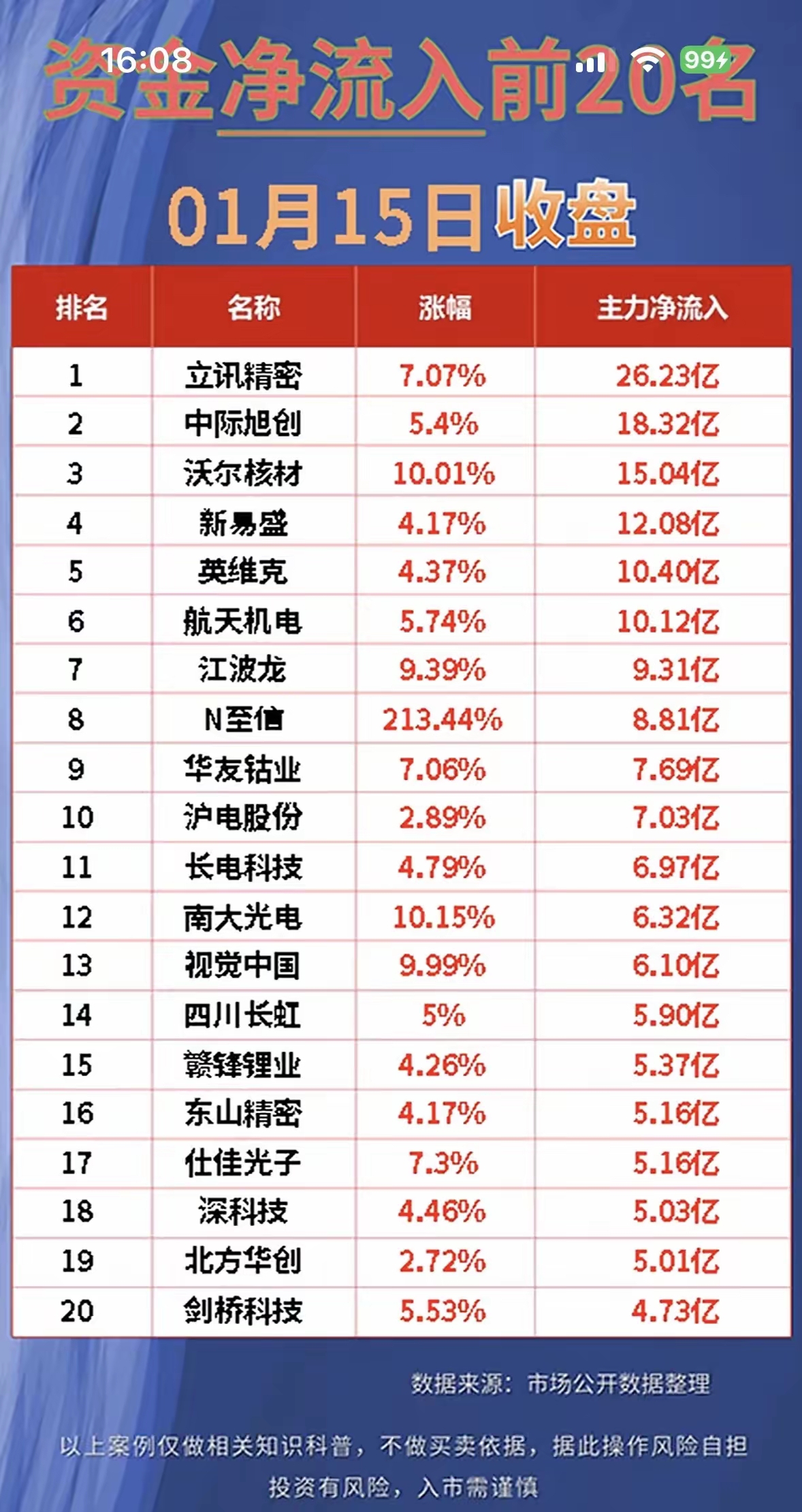 01月15日净流入前20名股票榜,快来一睹为快!"主力资金抢筹榜出炉!立讯精密、