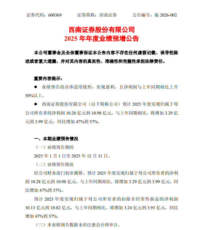 【西南证券:预计2025年年度归母净利润10.28亿元-10.98亿元】西南证券