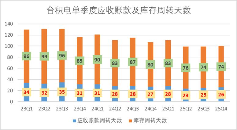四季度台积电的期间费用整体仅有8.4%,创过去五年间的新低,主要的成本项折旧摊销率,也大幅滑落至15%上下浮动,并且从产业链的角度来看,台积电的地位明显提升,应收账款周转天数,自2023年以来,下降了26天,库存周转的天数下降了8天,目前整体的库存周转天数仅为26天。
