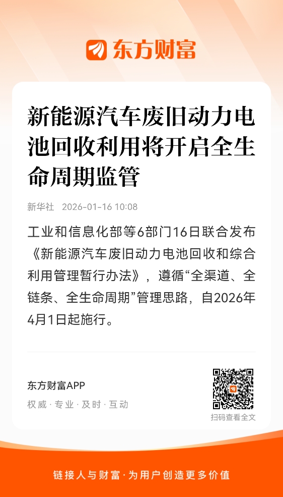 报废新能源汽车时必须“车电一体”,每块新能源汽车动力电池都将拥有数字身份证……工业和信息化部等6部门16日联合发布《新能源汽车废旧动力电池回收和综合利用管理暂行办法》,遵循“全渠道、全链条、全生命周期”管理思路,自2026年4月1日起施行。