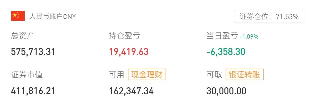 人民币账户证券仓位超七成,总资产41万,当日亏损超1%,现金理财30万,银证转账灵活。