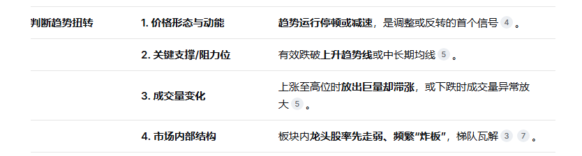 趋势转换:任何趋势都有终结的时候。要敏锐观察是否出现“高点不再创新高,低点被跌破” 的势头逆转信号。
