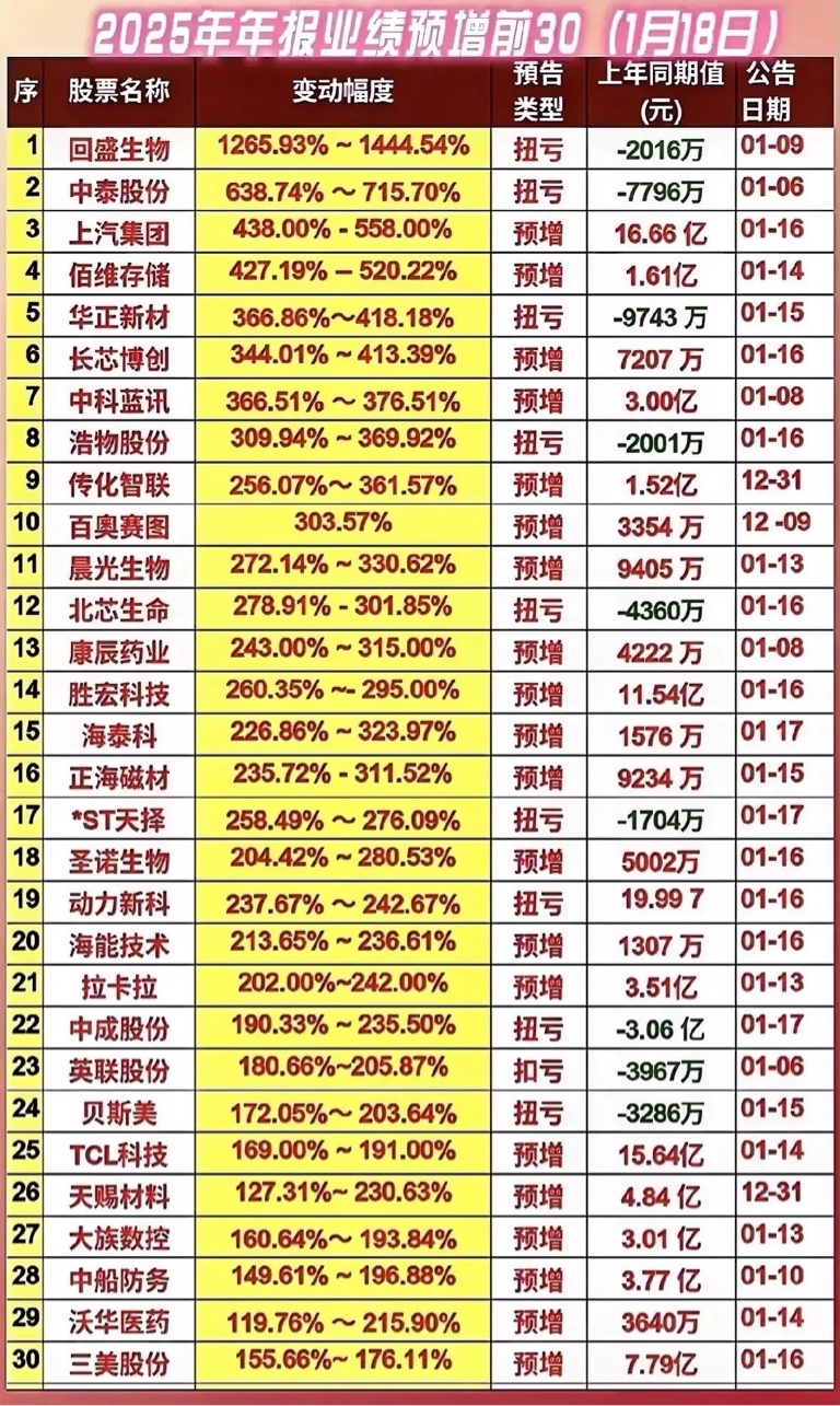 本次梳理涵盖扭亏、预增、扣亏三类业绩变动,行业分布横跨生物医药、化工、汽车、半导体、电子等领域,预增幅度从119.76%到1444.54%不等。其中扭亏个股多源于业务改善或资产处置,预增个股则受益于行业高景气或产能释放,是年报窗口期资金挖掘的核心方向,兼具短期催化与估值修复逻辑。