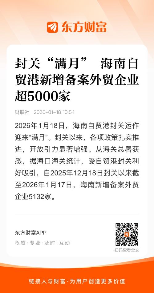 2026年1月18日,海南自贸港封关运作迎来“满月”。封关以来,各项政策扎实推进,开放引力显著增强。从海关总署获悉,据海口海关统计,受自贸港封关利好吸引,自2025年12月18日封关以来截至2026年1月17日,海南新增备案外贸企业5132家。