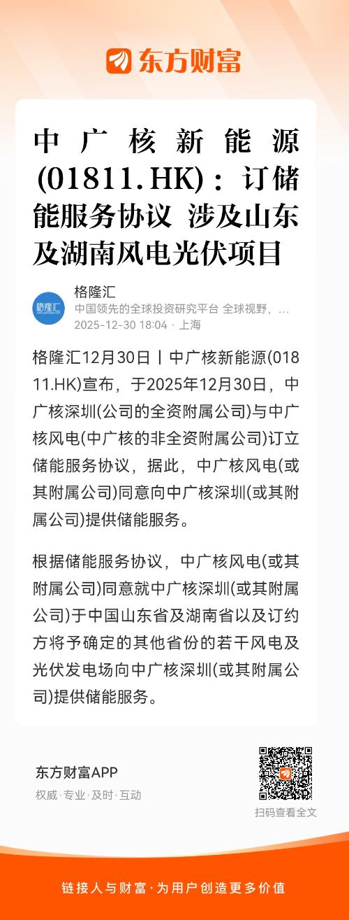 格隆汇12月30日丨中广核新能源(01811.HK)宣布,于2025年12月30日,中广核深圳(公司的全资附属公司)与中广核风电(中广核的非全资附属公司)订立储能服务协议,据此,中广核风电(或其附属公司)同意向中广核深圳(或其附属公司)提供储能服务。