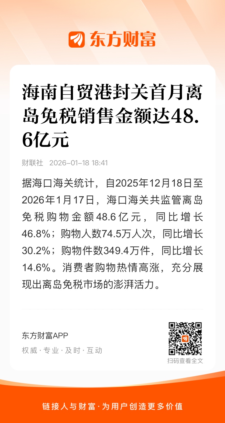 据海口海关统计,自2025年12月18日至2026年1月17日,海口海关共监管离岛免税购物金额48.6亿元,同比增长46.8%;购物人数74.5万人次,同比增长30.2%;购物件数349.4万件,同比增长14.6%。消费者购物热情高涨,充分展现出离岛免税市场的澎湃活力。