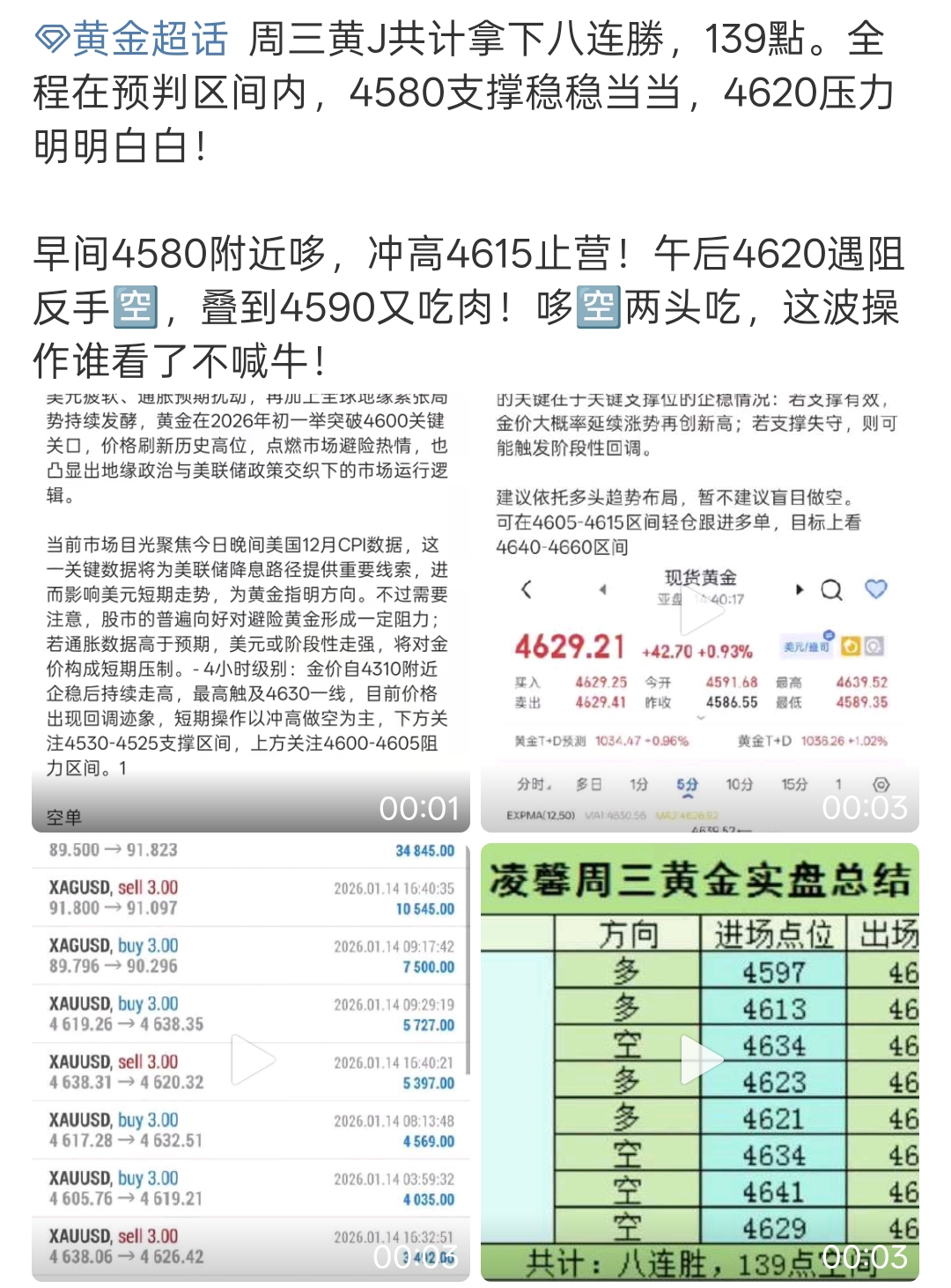 周三黄J共计拿下八连胜,139点。全程在预判区间内,4580支撑稳稳当当,4620压力明明白白!