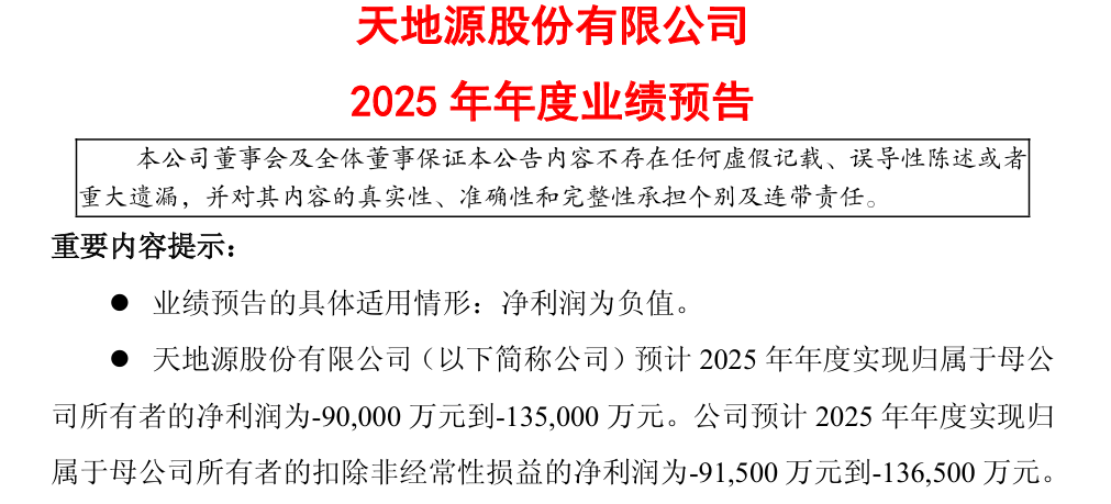 1月18日晚间,天地源(600665)公告称,公司预计2025年年度实现归属于母公司所有者的净利润-13.5亿元至-9亿元;归属于母公司所有者的扣除非经常性损益的净利润-13.65亿元至-9.15亿元。