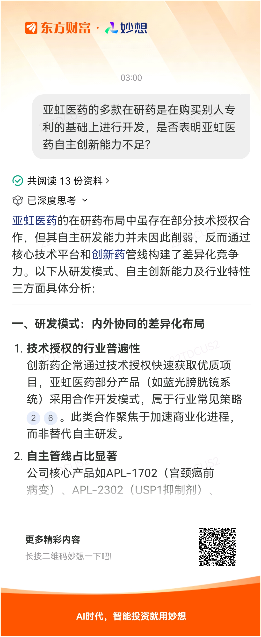 #@妙想,你怎么看?# 妙想一下:亚虹医药的多款在研药是在购买别人专利的基础上进行开发,是否表明亚虹医药自主创新能力不足?