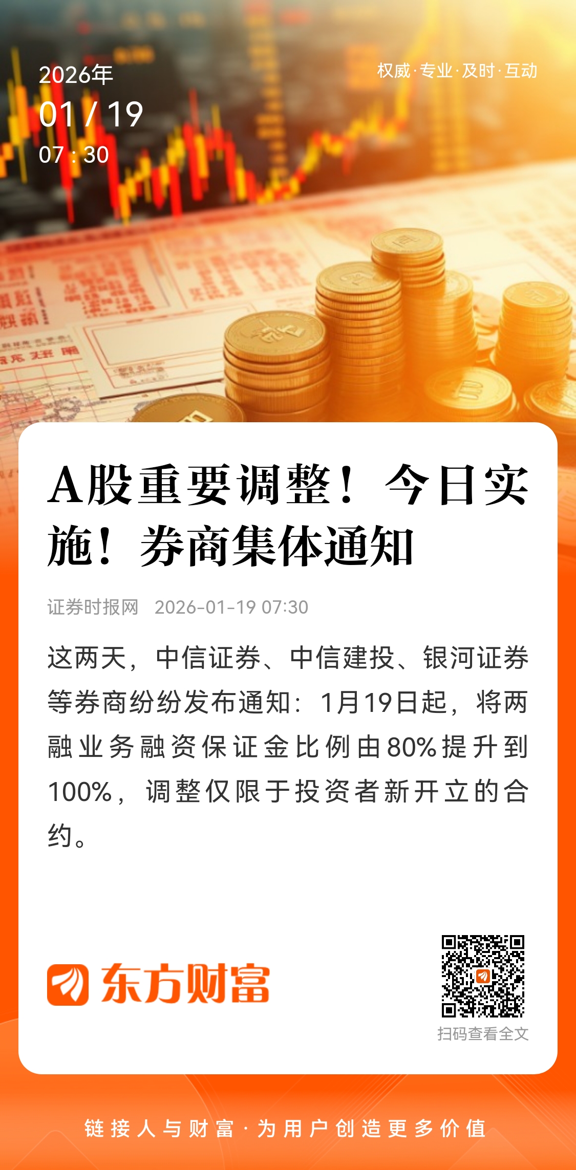 1月16日,银河证券表示,公司将对标的证券融资保证金比例进行调整。此次标的证券融资保证金比例调整自2026年1月19日起实施生效,实施前尚未了结的融资合约及其展期,融资保证金比例仍按照原标准执行。