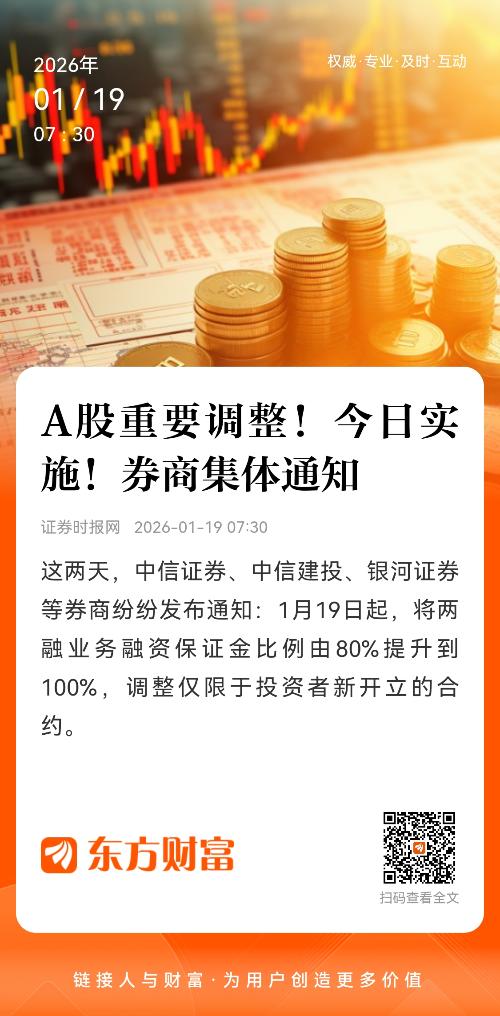 1月16日,招商证券称,根据证券交易所通知要求及《招商证券股份有限公司融资融券业务合同》相关约定,公司决定:在公司开立信用账户的投资者自2026年1月16日收市后新开仓的融资仓单的最低融资保证金比例调整为100%;投资者在2026年1月16日前(含当日)已开仓且尚未了结的融资仓单及其展期,所适用的融资保证金比例不受影响。
