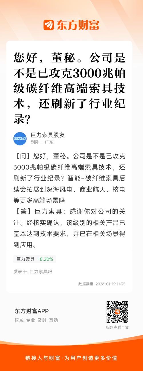 您好,董秘。公司是不是已攻克3000兆帕级碳纤维高端索具技术,还刷新了行业纪录?智能+碳纤维索具后续会拓展到深海风电、商业航天、核电等更多高端场景吗