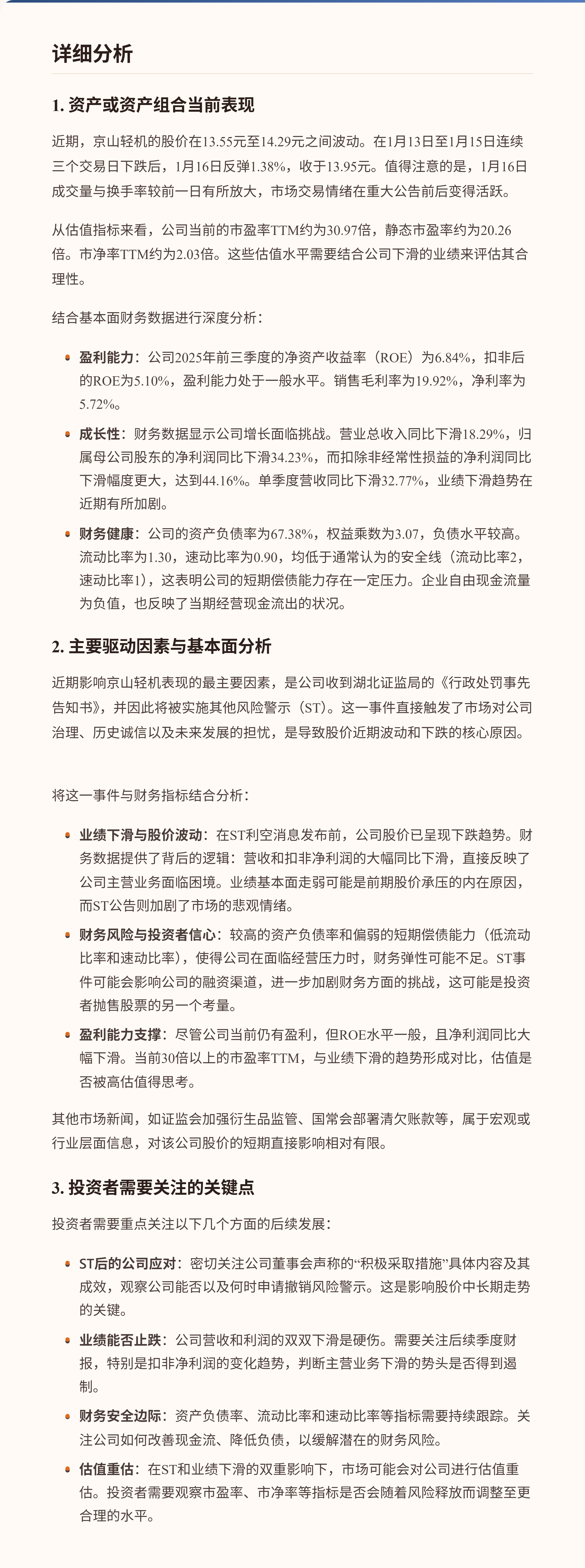 $京山轻机(SZ000821)$ 京山轻机因历史年报存在虚假记载,将于1月20日起被实施其他风险警示,股票简称变更为“ST京机”。这一重大负面事件是当前影响公司股价的核心风险。从财务数据看,公司2025年前三季度营收和净利润同比均出现显著下滑,扣非净利润同比下降超过44%,基本面面临压力。同时,公司资产负债率较高,短期偿债能力指标偏弱,财务结构需要关注。