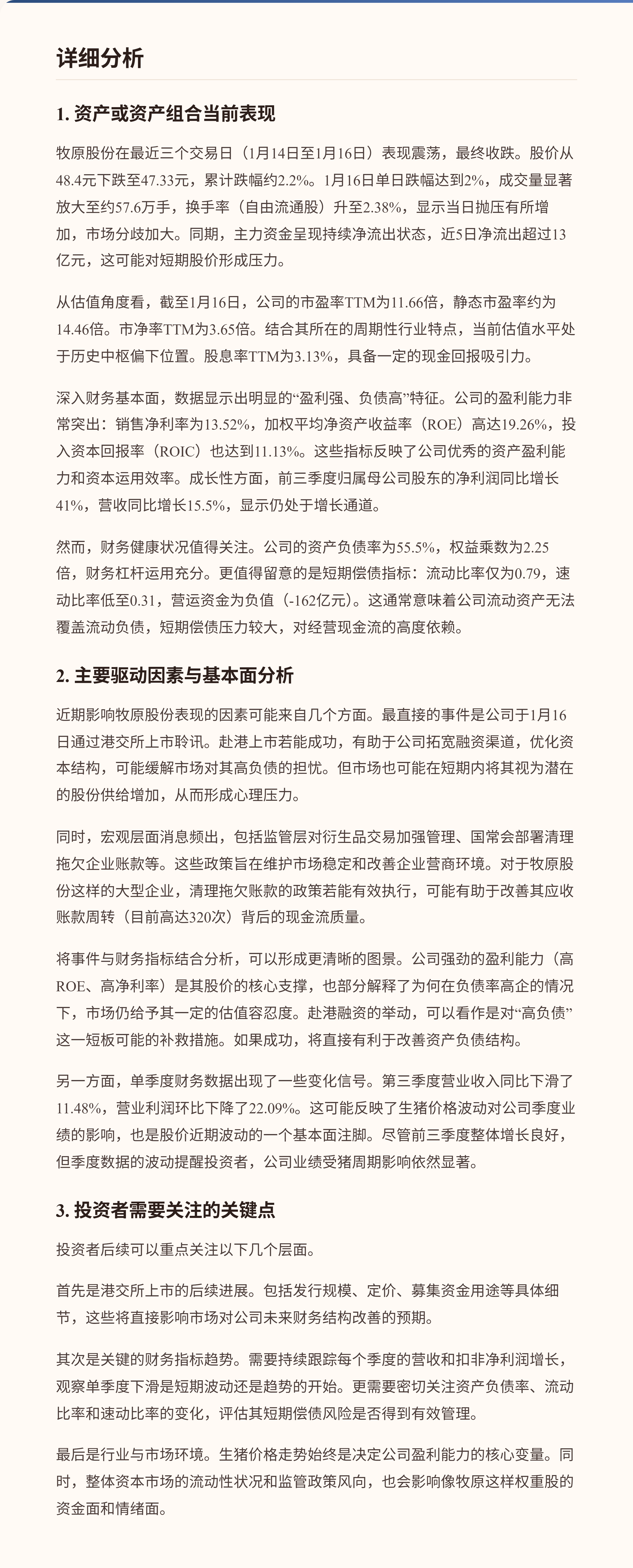 $牧原股份(SZ002714)$ 牧原股份近期股价出现小幅回调,市场关注点集中于其通过港交所聆讯的进展以及整体市场环境的变化。公司当前估值处于历史相对低位,市盈率TTM约为11.9倍,同时提供了超过3%的股息率。财务数据显示其盈利能力强劲,净资产收益率(ROE)接近20%,但需要关注其较高的资产负债率和偏低的短期偿债能力。