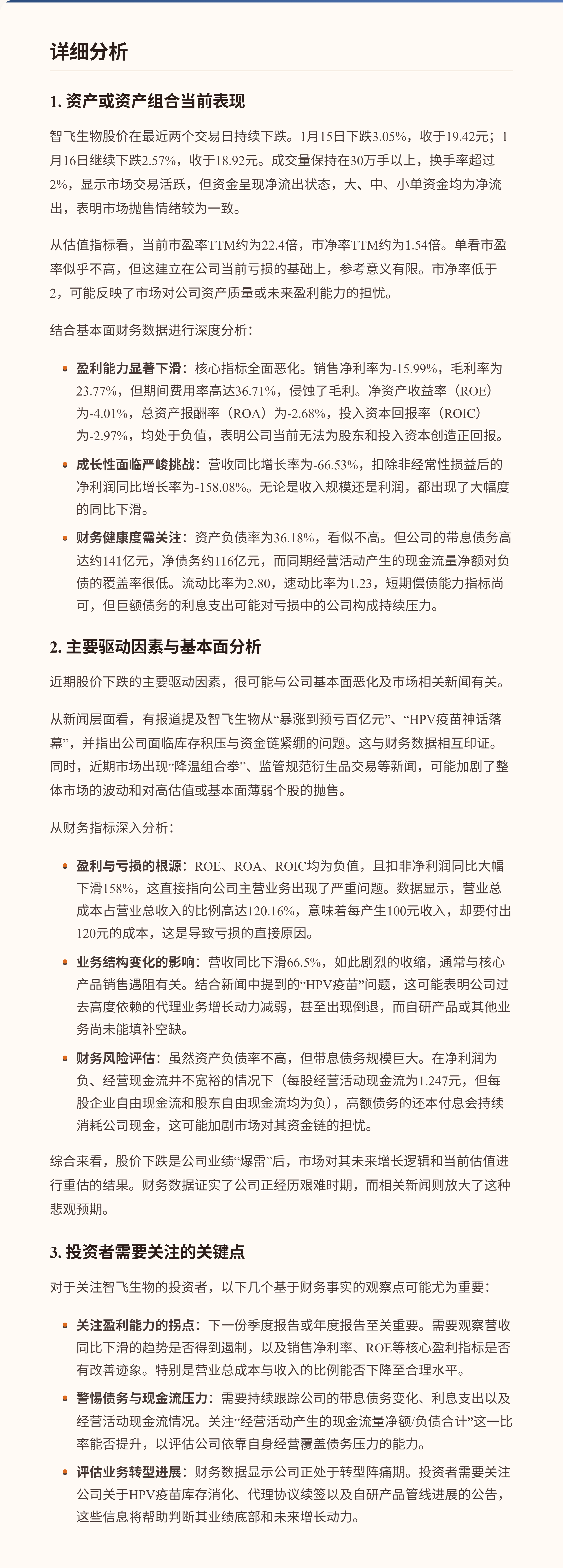 $智飞生物(SZ300122)$ 智飞生物近期股价连续下跌,核心逻辑在于其基本面发生了显著变化。公司2025年三季度报告显示,因独家代理的HPV疫苗业务面临挑战,导致营收同比大幅下滑66.5%,并出现巨额亏损,扣非净利润为负。关键财务指标反映出盈利能力急剧恶化,销售净利率为-16.0%,净资产收益率(ROE)为-4.0%。同时,公司带息债务规模较高,财务结构值得关注。