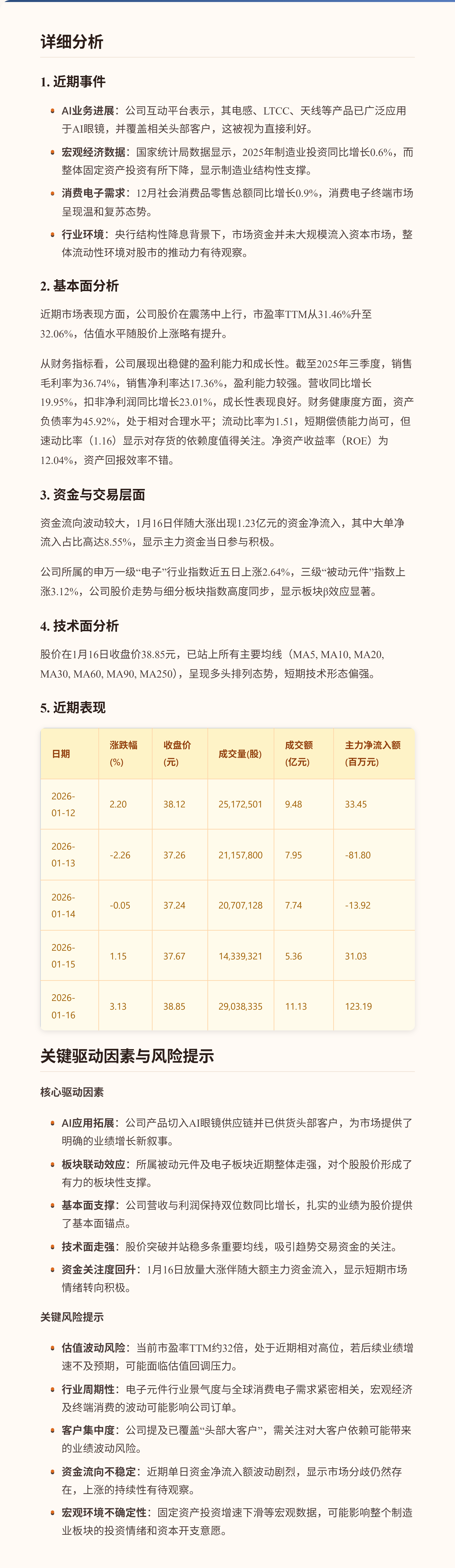 $顺络电子(SZ002138)$ 顺络电子股价在最近五个交易日呈现震荡上行态势,1月16日录得3.13%的显著涨幅。股价表现主要受到公司AI相关业务进展消息的提振,以及所属被动元件板块整体走强的带动。关键亮点在于公司明确表示其产品已覆盖AI眼镜头部客户,为未来增长提供了新的想象空间。