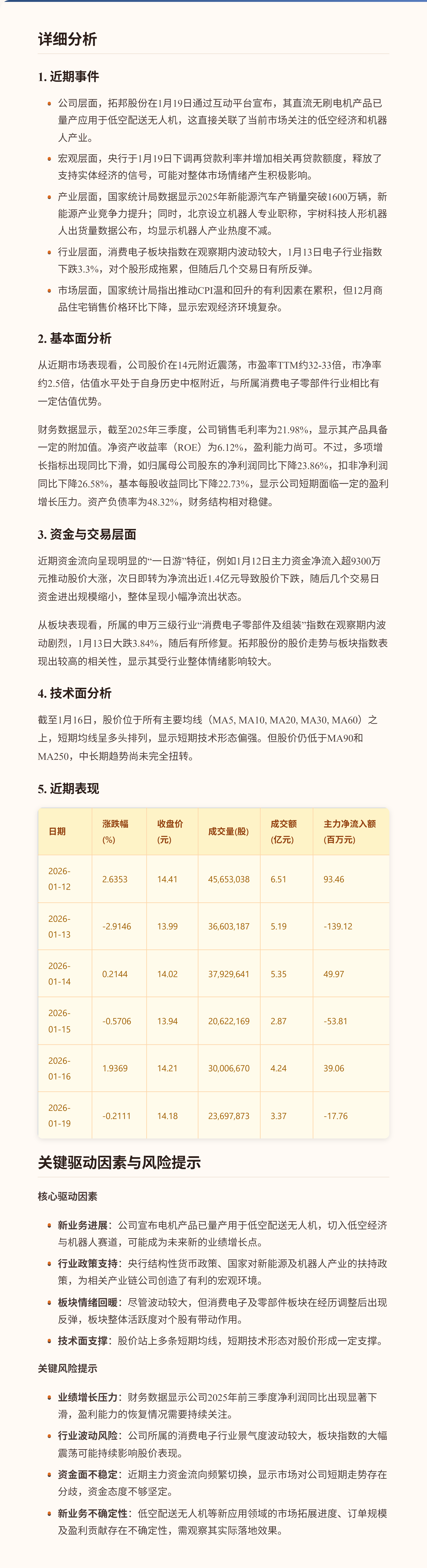 $拓邦股份(SZ002139)$ 拓邦股份股价在近期呈现震荡走势,主要受到市场对消费电子板块情绪波动以及公司自身业务新进展消息的共同影响。1月12日股价上涨后,13日出现较大幅度回调,随后几个交易日窄幅震荡。一个关键亮点是公司于1月19日宣布其直流无刷电机产品已量产应用于低空配送无人机,为市场提供了新的增长想象空间。