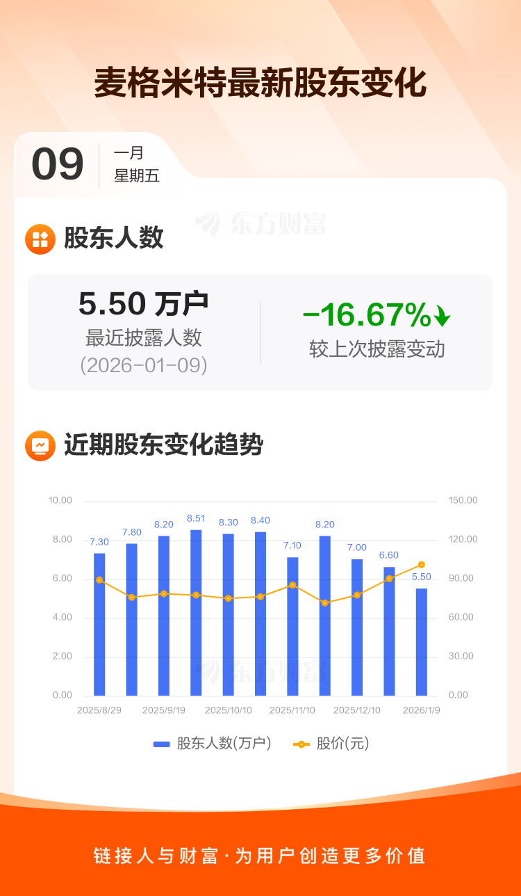 麦格米特最新披露数据显示,截至1月9日公司股东户数为5.50万户,较上期(2025年12月31日)减少1.10万户,降幅为16.67%。户均持有流通股数量由上期的6937股上升至8324股,户均持股金额由上期的62.49万元增加至83.92万元。