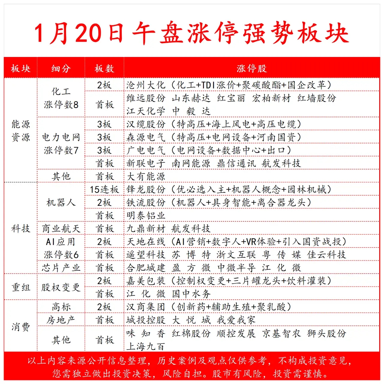 1月20日午盘涨停强势板块