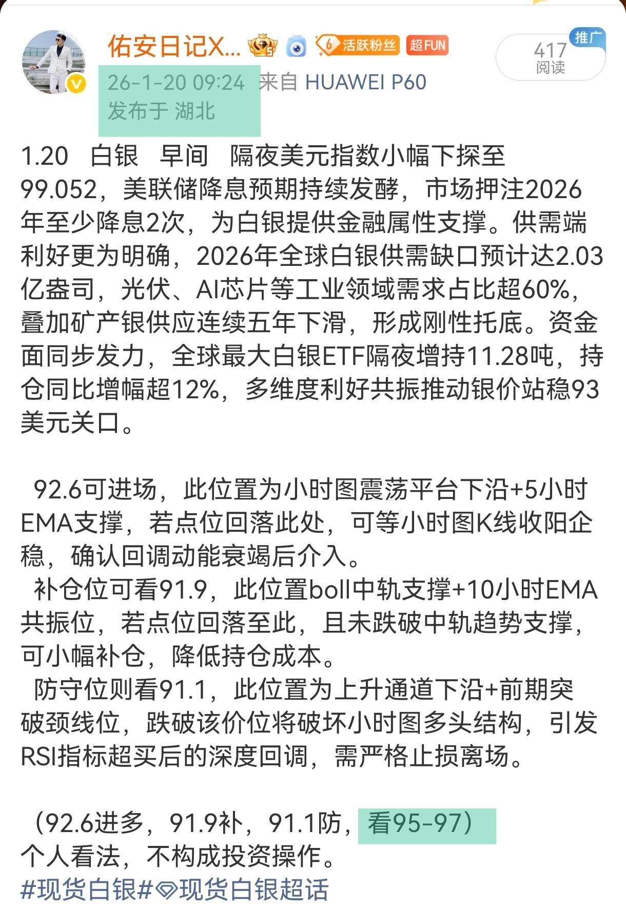 佑安早间给出的初始目标9⃣5⃣已被走势兑现,佑安预告在前,白银再创新高。